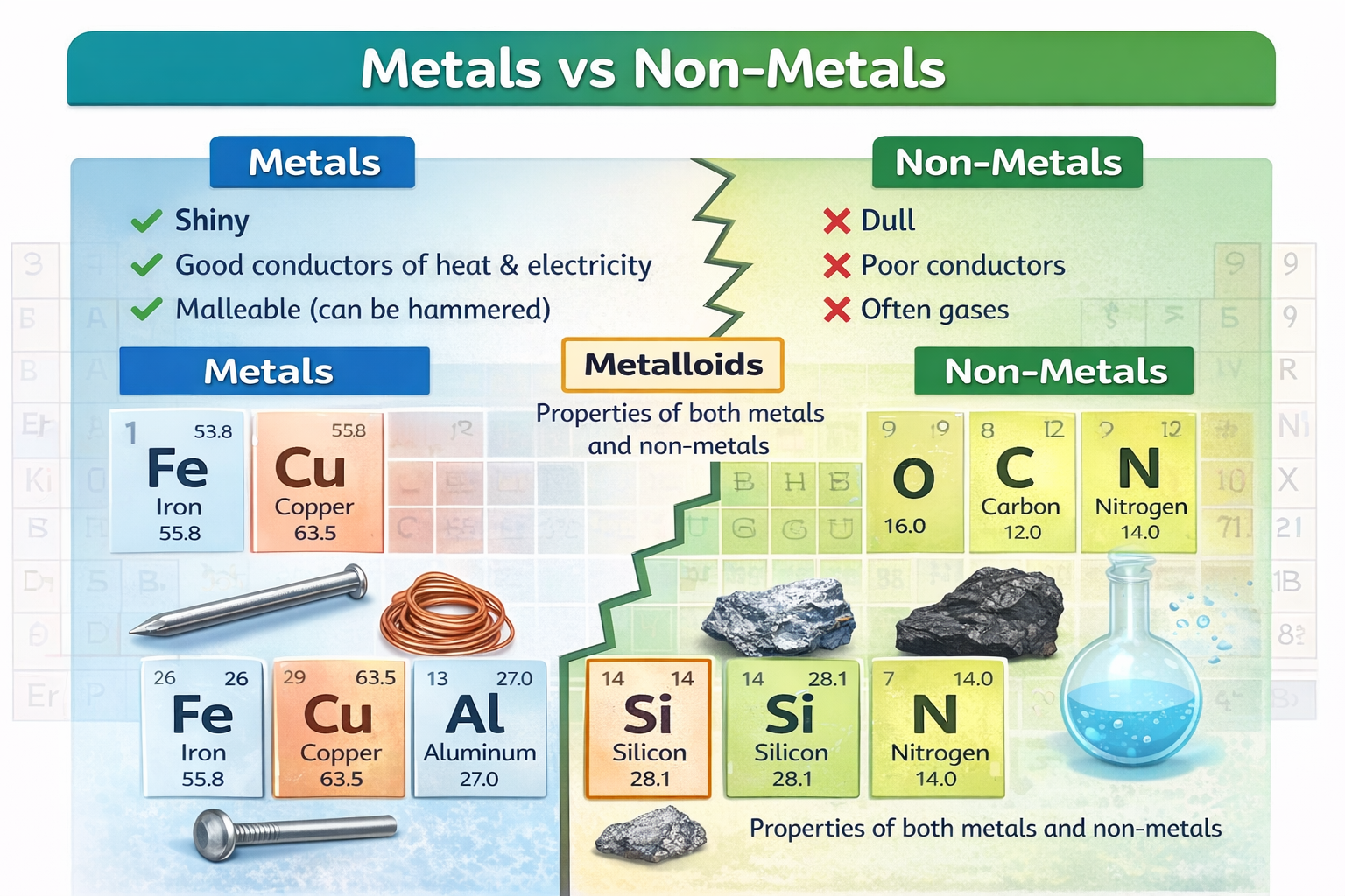 Example: Iron is a metal, oxygen is a non-metal, silicon is a metalloid.